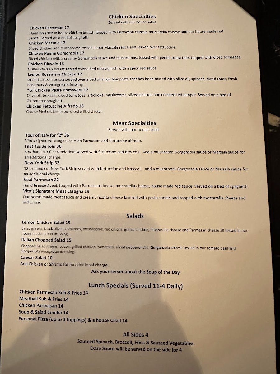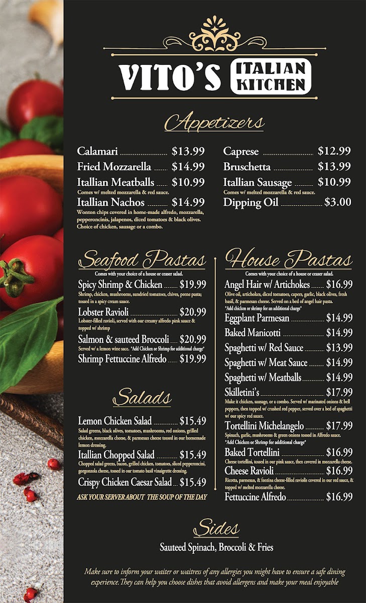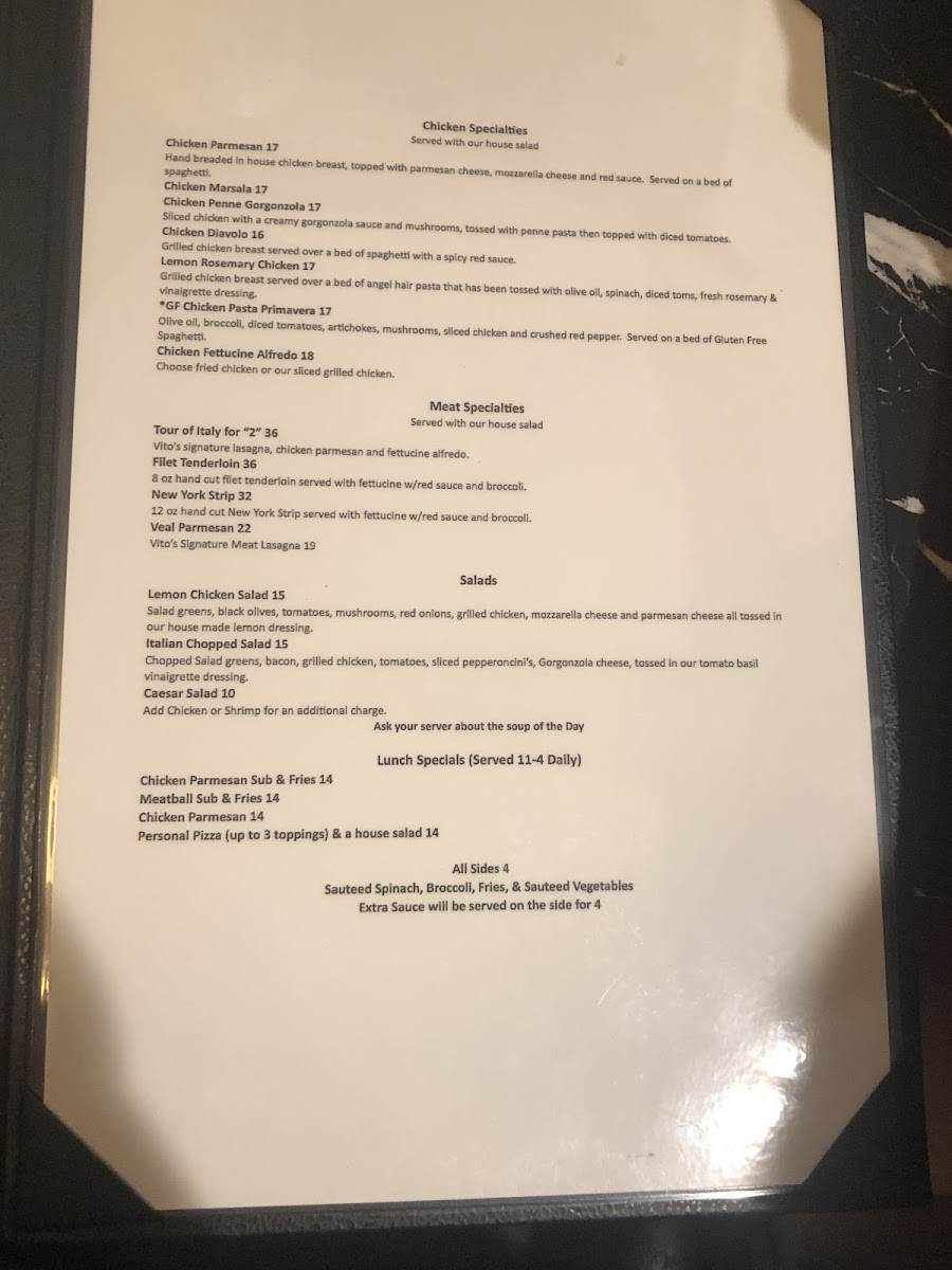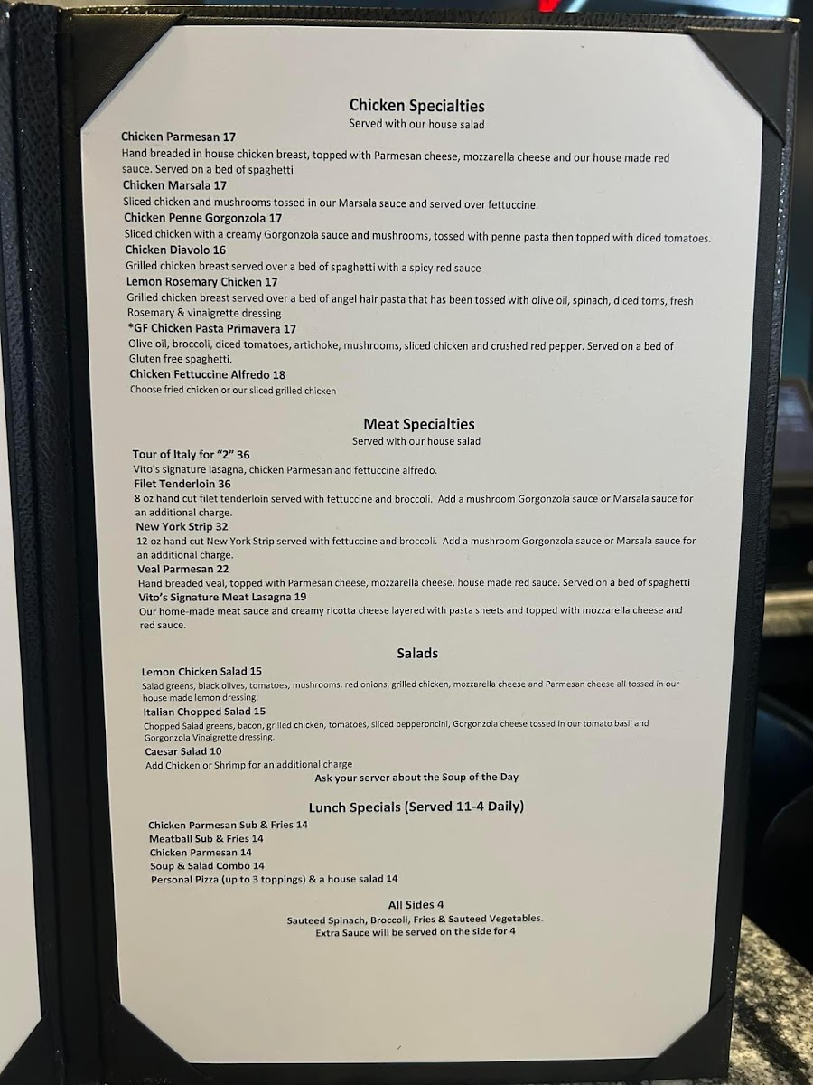 The menu at Vito’s Italian Kitchen offers a wide variety of Italian-inspired dishes, with something for everyone. Start with an appetizer like the crispy Calamari or the flavorful Bruschetta. For a heartier beginning, try the Italian Meatballs w/Melted Mozzarella and Red Sauce or the Italian Sausage Link w/Melted Mozzarella and Red Sauce. Seafood lovers can indulge in dishes like the Spicy Shrimp & Chicken, Lobster Ravioli, or the creamy Shrimp Fettuccine Alfredo. The house pasta options are equally inviting, with choices like the Angel Hair with Artichokes, the hearty Baked Manicotti, or the classic Spaghetti w/Meat Sauce. Pizzas range from the indulgent Lotsa Pepperoni to the savory Meat Lovers and Supreme options, while the Hawaiian and Alfredo pizzas offer a delightful twist on traditional flavors. For chicken lovers, the Chicken Parmesan and Chicken Marsala are standout choices, along with the zesty Chicken Piccata and creamy Chicken Penne Gorgonzola. Meat dishes include the rich Tour of Italy for "1", tender Filet Mignon, and the classic Veal Parmesan. For a comforting finale, the Vito's Signature Meat Lasagna is a must-try. To complement any meal, the Lemon Chicken Salad and Crispy Chicken Caesar Salad provide a fresh, flavorful touch. With such a diverse menu, Vito's Italian Kitchen promises a delicious experience for every taste.