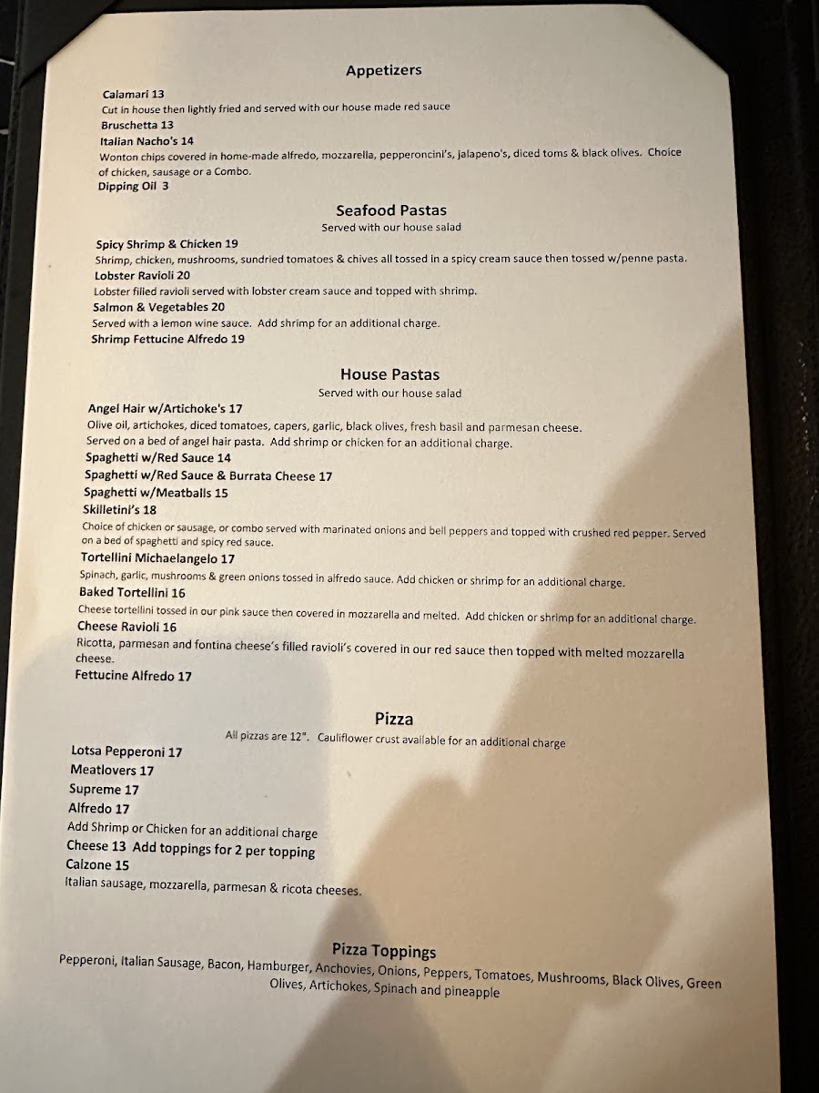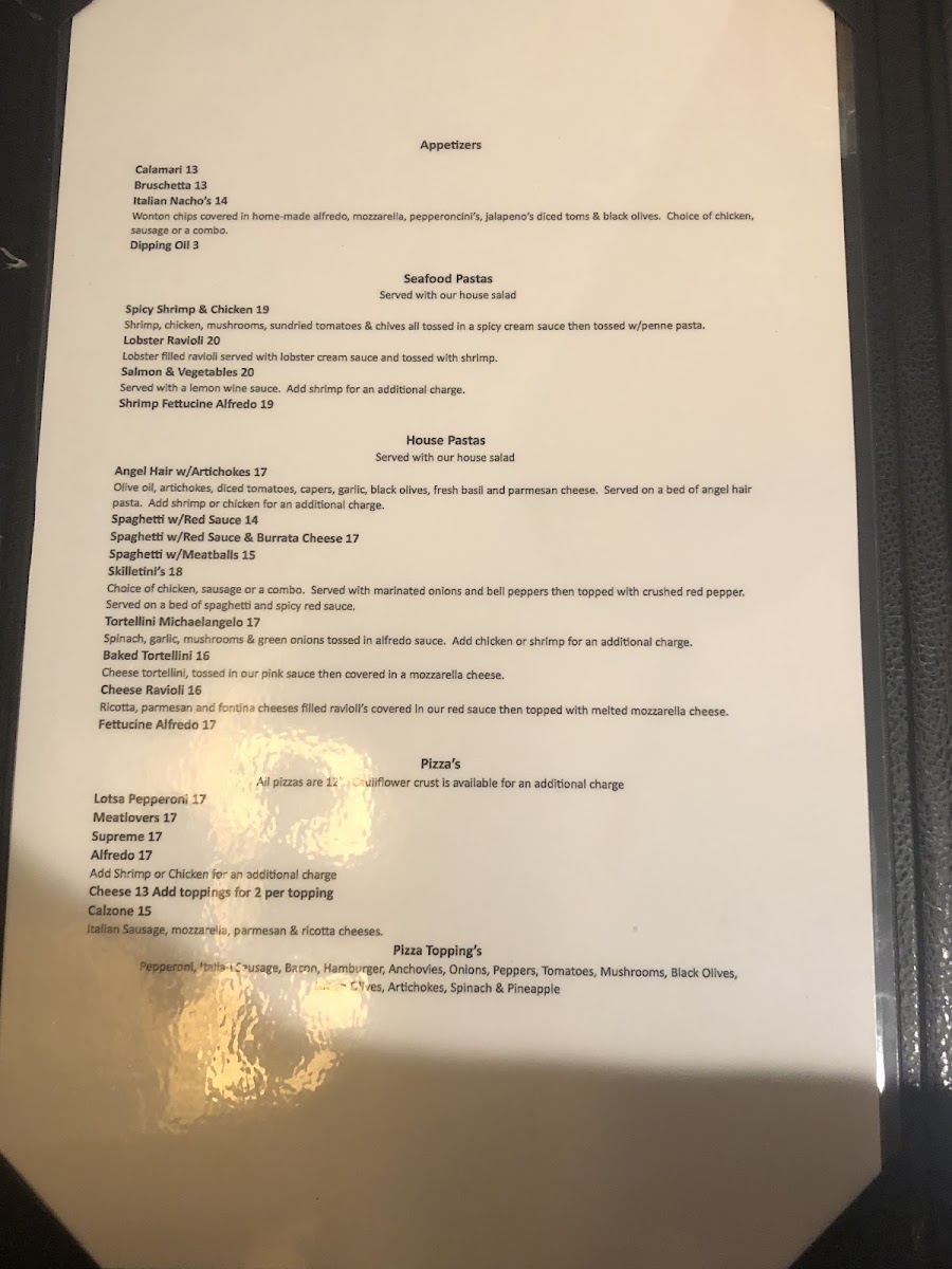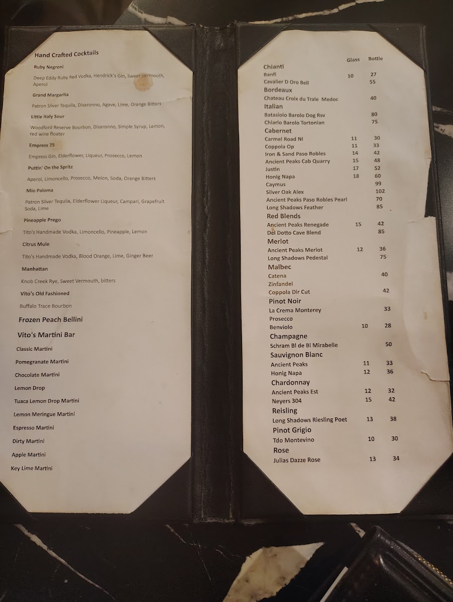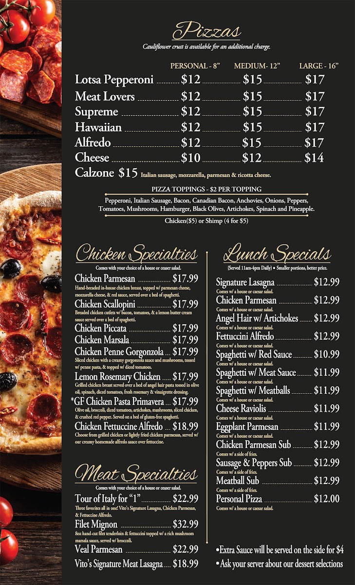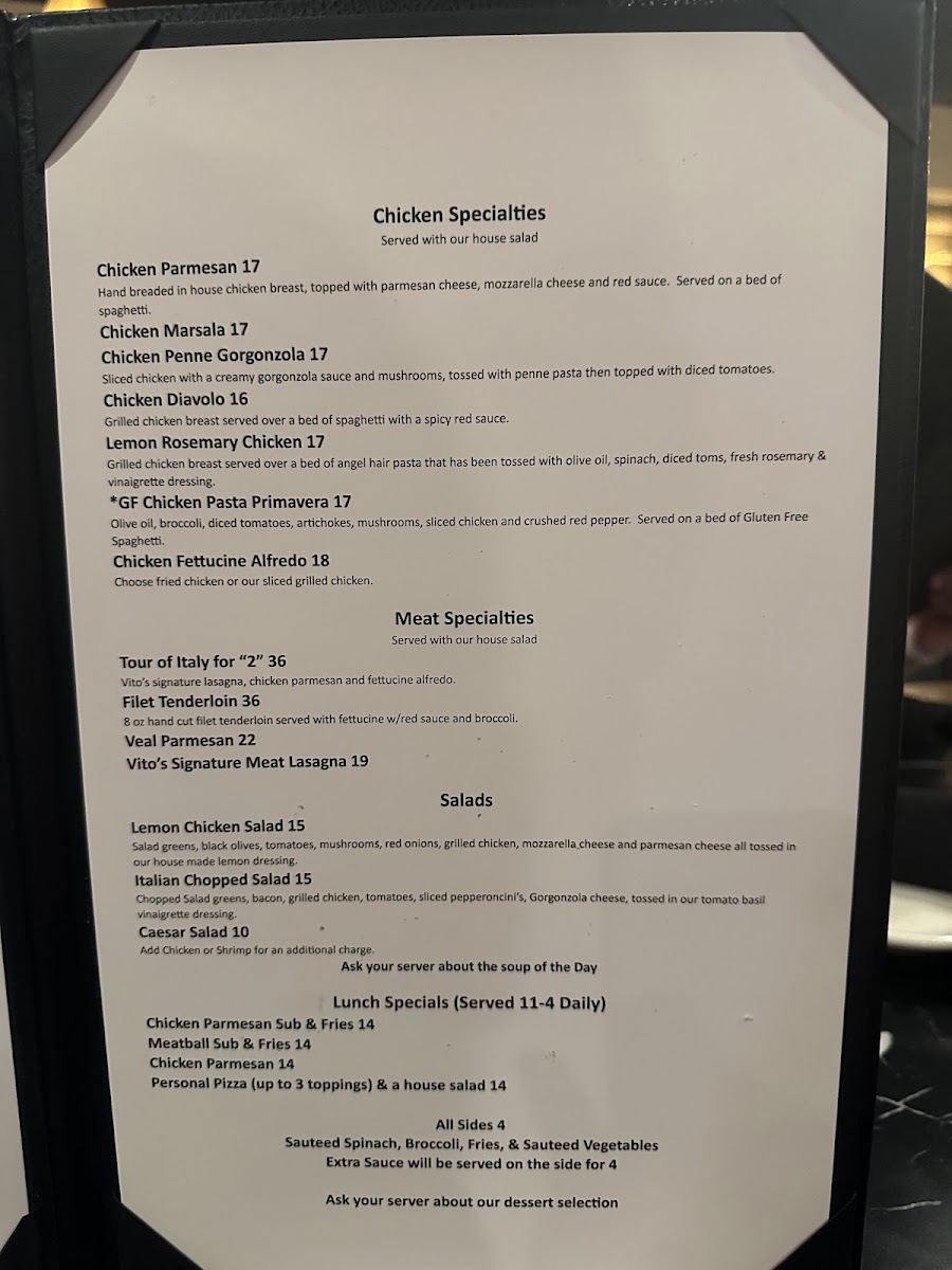 The menu at Vito’s Italian Kitchen offers a wide variety of Italian-inspired dishes, with something for everyone. Start with an appetizer like the crispy Calamari or the flavorful Bruschetta. For a heartier beginning, try the Italian Meatballs w/Melted Mozzarella and Red Sauce or the Italian Sausage Link w/Melted Mozzarella and Red Sauce. Seafood lovers can indulge in dishes like the Spicy Shrimp & Chicken, Lobster Ravioli, or the creamy Shrimp Fettuccine Alfredo. The house pasta options are equally inviting, with choices like the Angel Hair with Artichokes, the hearty Baked Manicotti, or the classic Spaghetti w/Meat Sauce. Pizzas range from the indulgent Lotsa Pepperoni to the savory Meat Lovers and Supreme options, while the Hawaiian and Alfredo pizzas offer a delightful twist on traditional flavors. For chicken lovers, the Chicken Parmesan and Chicken Marsala are standout choices, along with the zesty Chicken Piccata and creamy Chicken Penne Gorgonzola. Meat dishes include the rich Tour of Italy for "1", tender Filet Mignon, and the classic Veal Parmesan. For a comforting finale, the Vito's Signature Meat Lasagna is a must-try. To complement any meal, the Lemon Chicken Salad and Crispy Chicken Caesar Salad provide a fresh, flavorful touch. With such a diverse menu, Vito's Italian Kitchen promises a delicious experience for every taste.